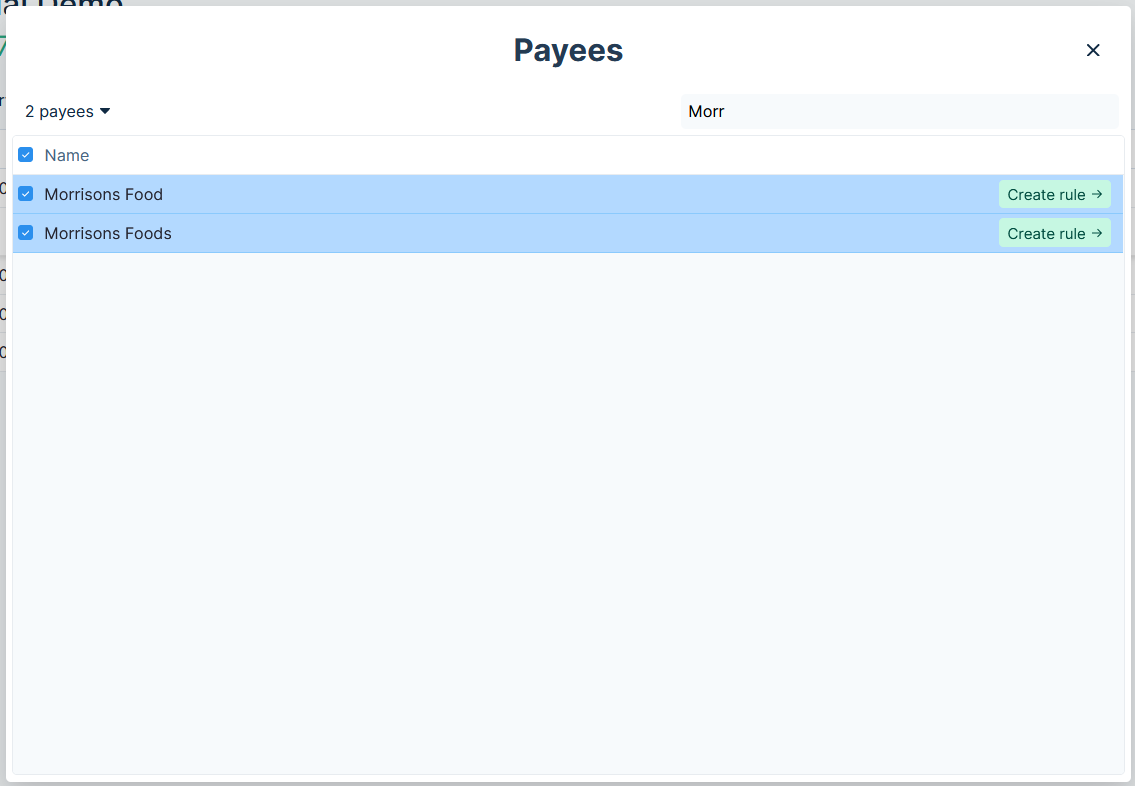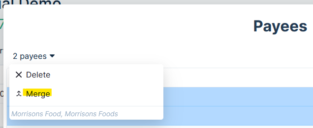 A powerful feature is merging payees. You may already have months worth of data and a lot of ugly Morrisons payees that all vary slightly. You want to merge all of these together into one payee.