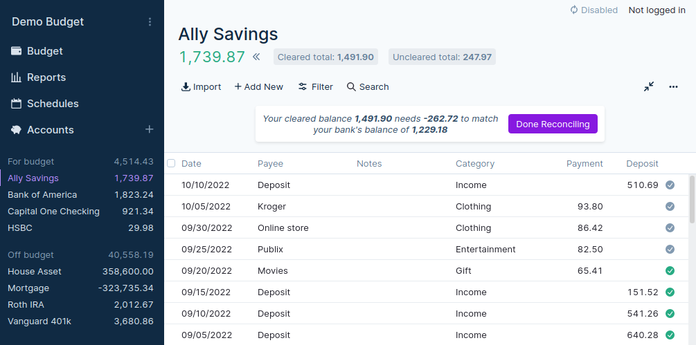 When you reconcile, you will be comparing your bank statement, print or online, against Actual's ledger for that account. If you have made transactions against the budget that have not been verified against your account the cleared flag will be shown in grey. If the transaction has been moved out of the pending section (online) of your bank statement, click the grey circle to turn it green. This is a visual indication that the transaction is in both your budget and in your account statement, and they match.