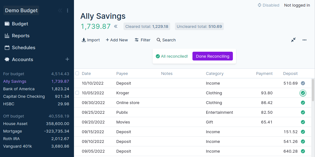 By clicking on the green balance in the header of the account view, two more category balances will come into view. The cleared total only includes transactions that have been cleared while the uncleared total will represent the transactions you have entered but may not have entered the bank statement yet.