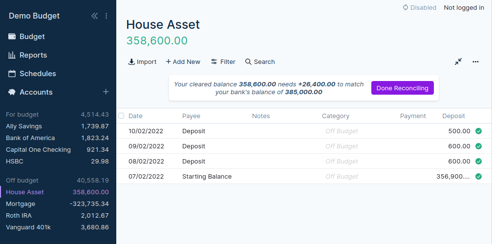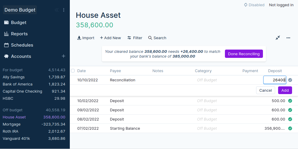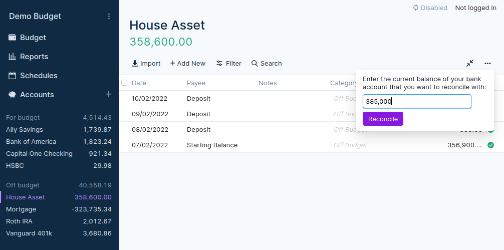 Some use off-budget accounts to track values of assets such as vehicles, real estate, retirement accounts, or other investment accounts or property. The reconciliation tool is useful to update these values as well. Let's say we have a house that was valued at 358,700 but with current changes in the market it is now valued at 385,000. We go to the ledger for the house, choose the reconciliation tool, and enter 385,000 as the new value into the tool.