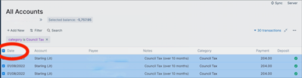 To duplicate transactions (one or more), simply navigate to the Accounts page as described above, and select the tick box in the left hand column. Once selected, go to the drop down menu on the top right of the page, above the table header. Open the menu and select “Duplicate”. Your newly duplicated transactions will appear in the transactions table!