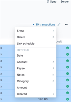 Now you are ready to alter one or more components of these selected transactions. Go to the drop down top right (in this case the arrow below “30 transactions”)