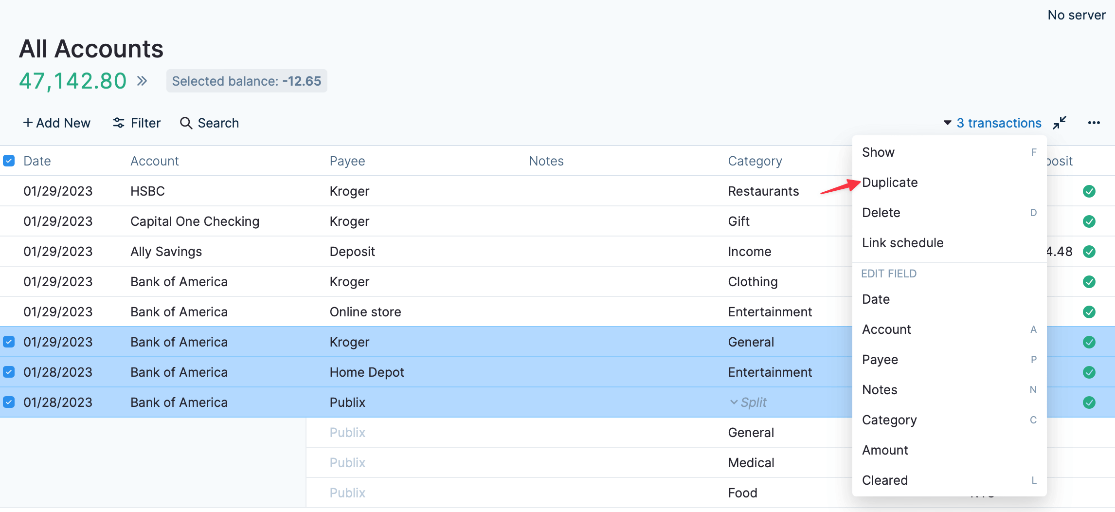 It can be extremely useful to be able to bulk edit or duplicate a number of transactions at once.