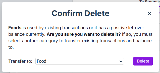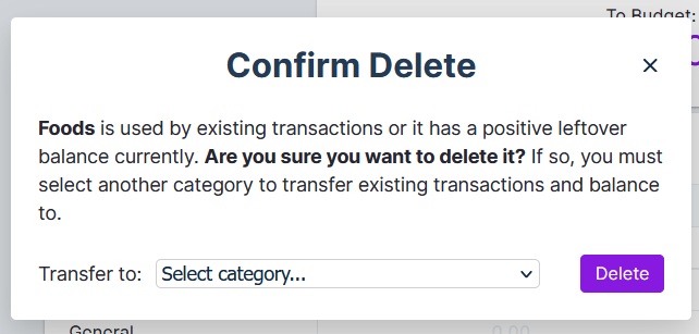 If the category your deleting has a positive balance OR has been used for existing transactions you will be presented with a box to select which category the balance and or transactions should be moved to.