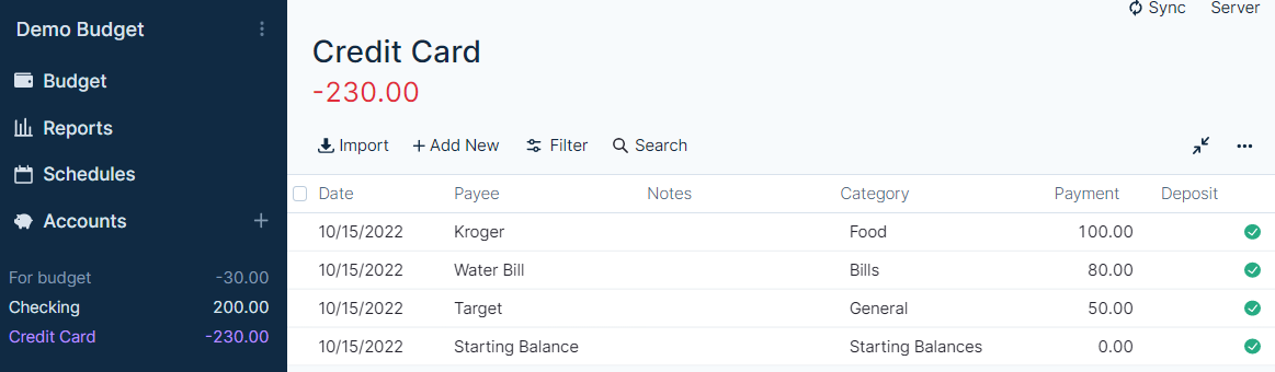 Now my Credit Card account matches my Credit Card debt category. Next month that -30 will still be in my Credit Card debt category so I'm going to work extra hard to pay it off.