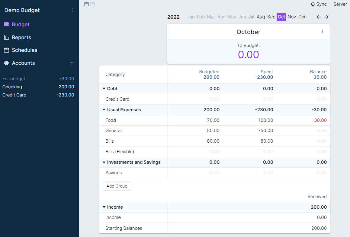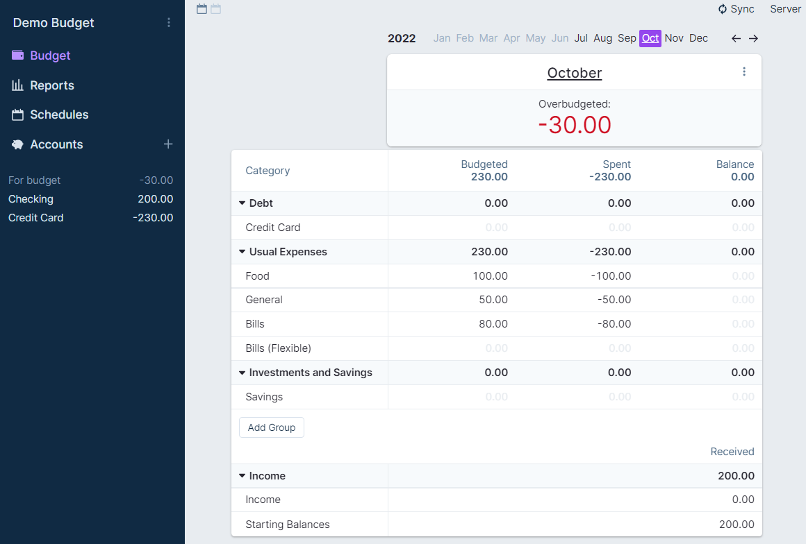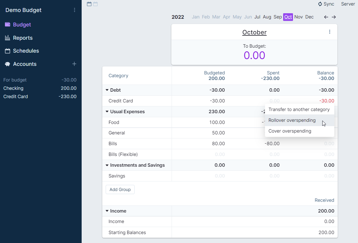 Here is my budget. You'll see I only have 200 in my checking account, so I was only able to budget 200 this month. That's a problem because I overspent by 30.