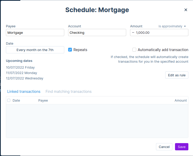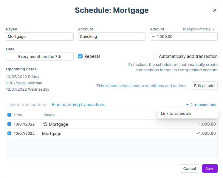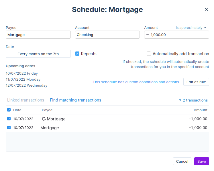 In addition to the requirements you have specified when creating a schedule, a transaction must also meet the date requirements to be matched to a schedule. Transactions must be dated within 2 days before or after a schedule.