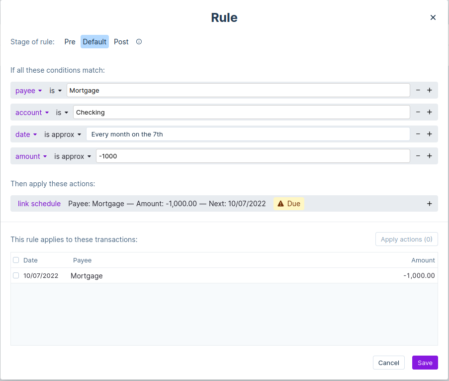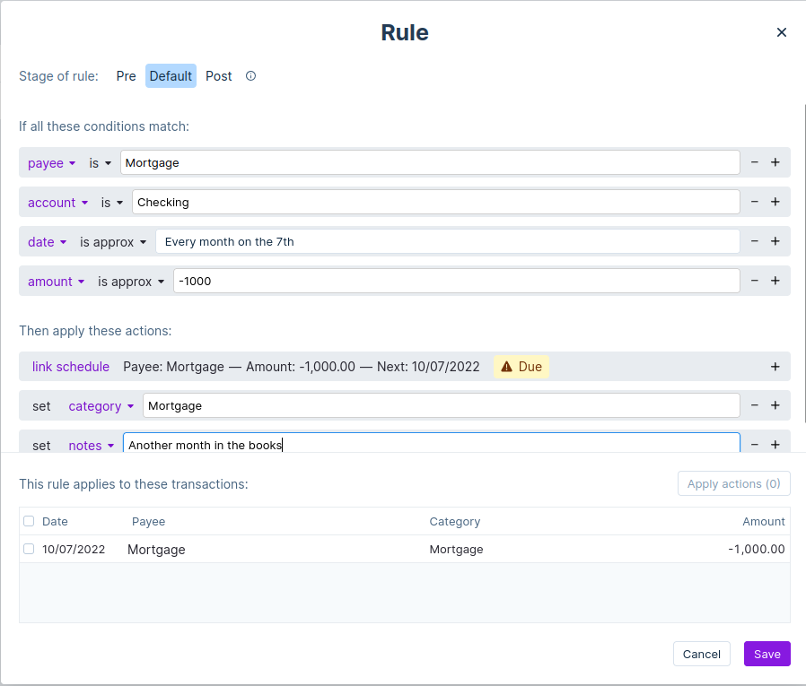 You can apply this newly made rule to any other of the linked transactions. Select all of the transactions from the rules dialog and press Apply actions.