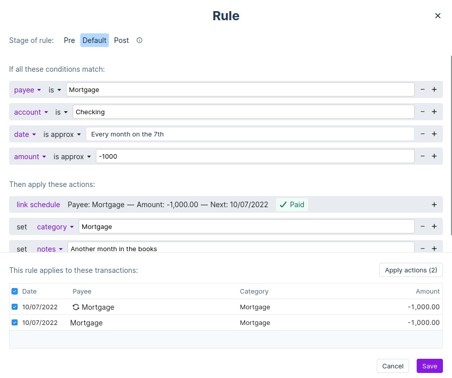 Many times it's desired to add notes to the scheduled transactions or to assign categories automatically. This is done with the Rules tool.